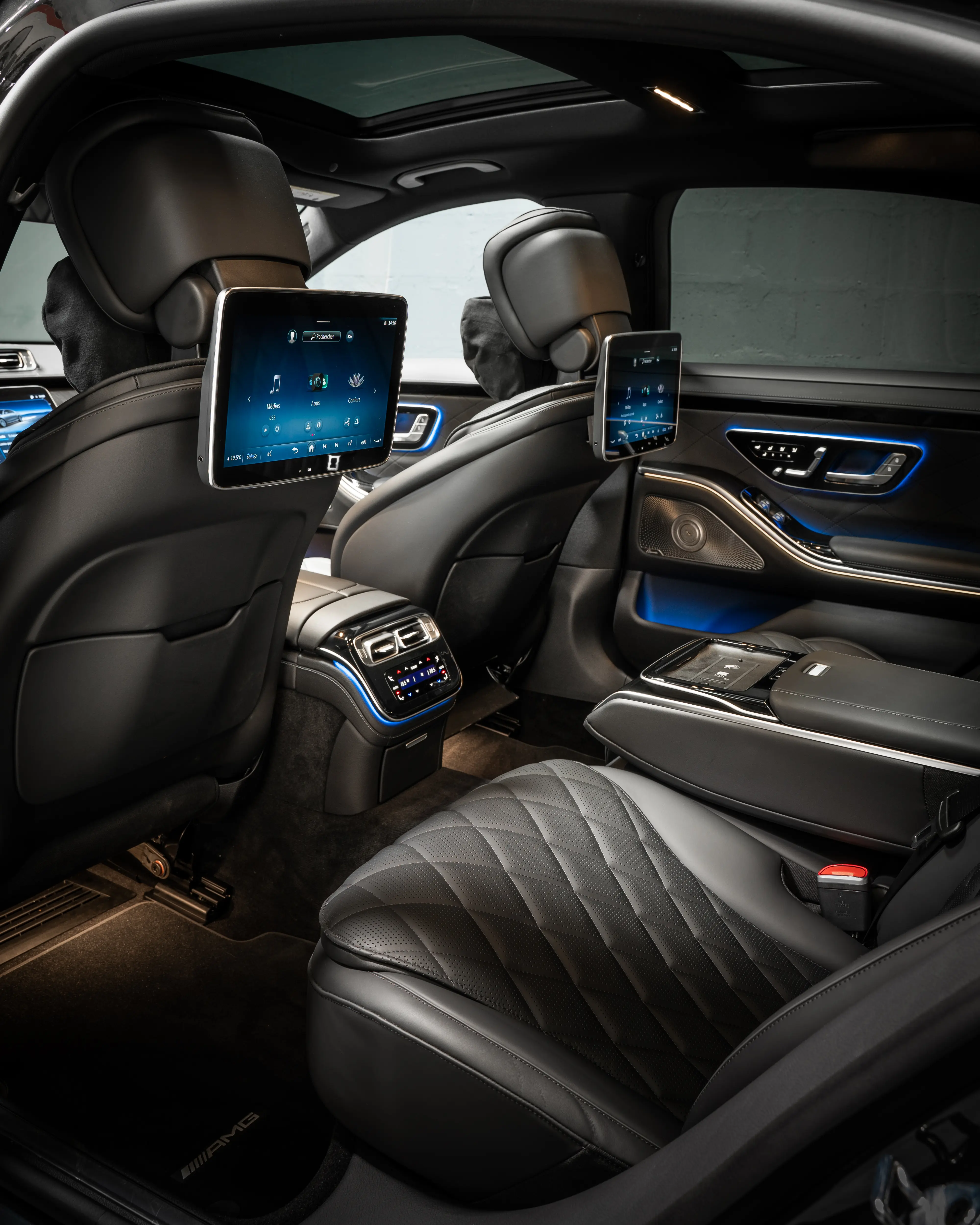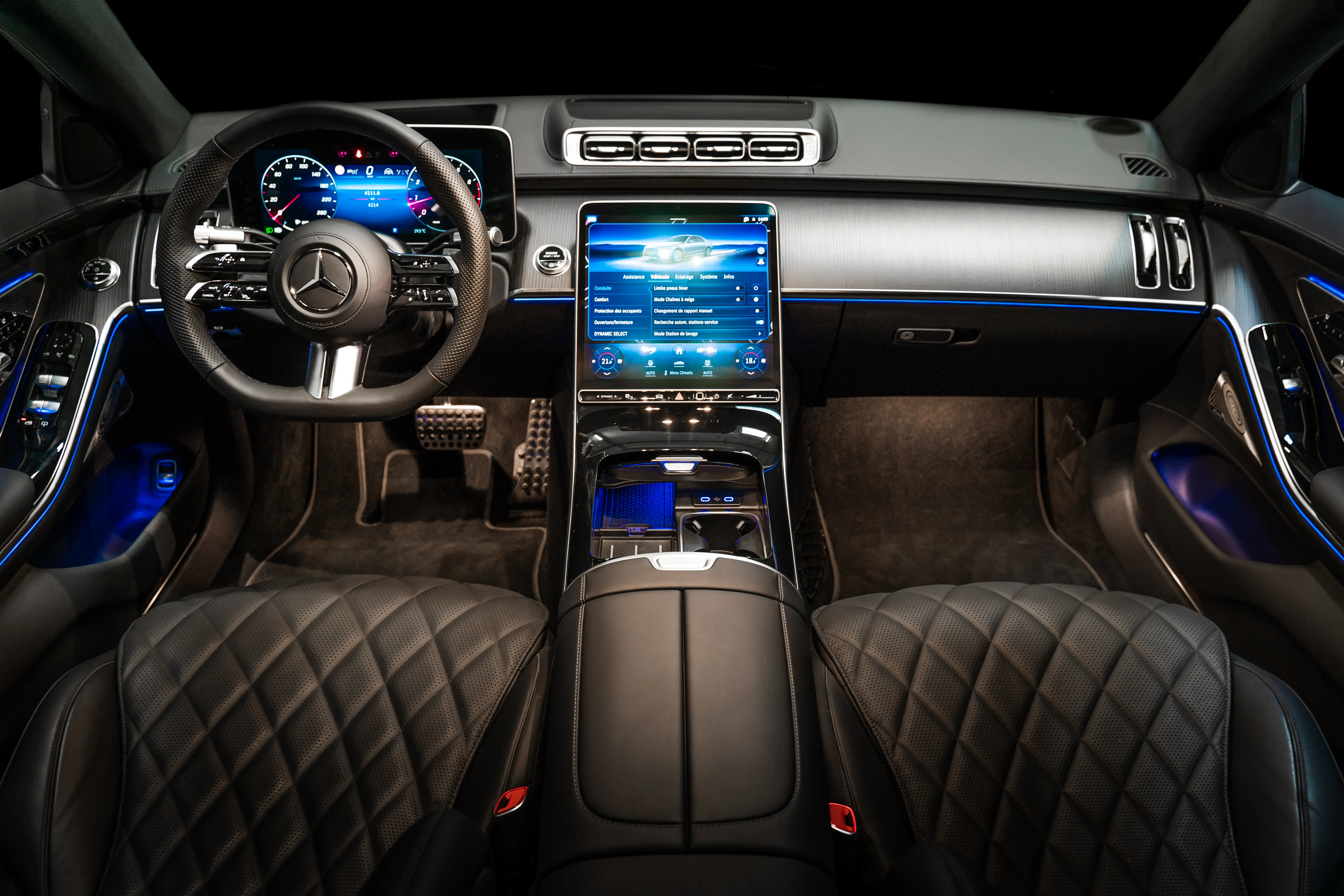 The interior of the Mercedes S-Class 580 is an example of craftsmanship and luxury. The comfortable, adjustable leather seats offer optimum support on long journeys. On-board space is generous, offering ample room for passengers and luggage. The cabin is equipped with top-of-the-range materials, customisable ambient lighting and advanced features such as touch screens, a top-of-the-range audio system and a navigation system.